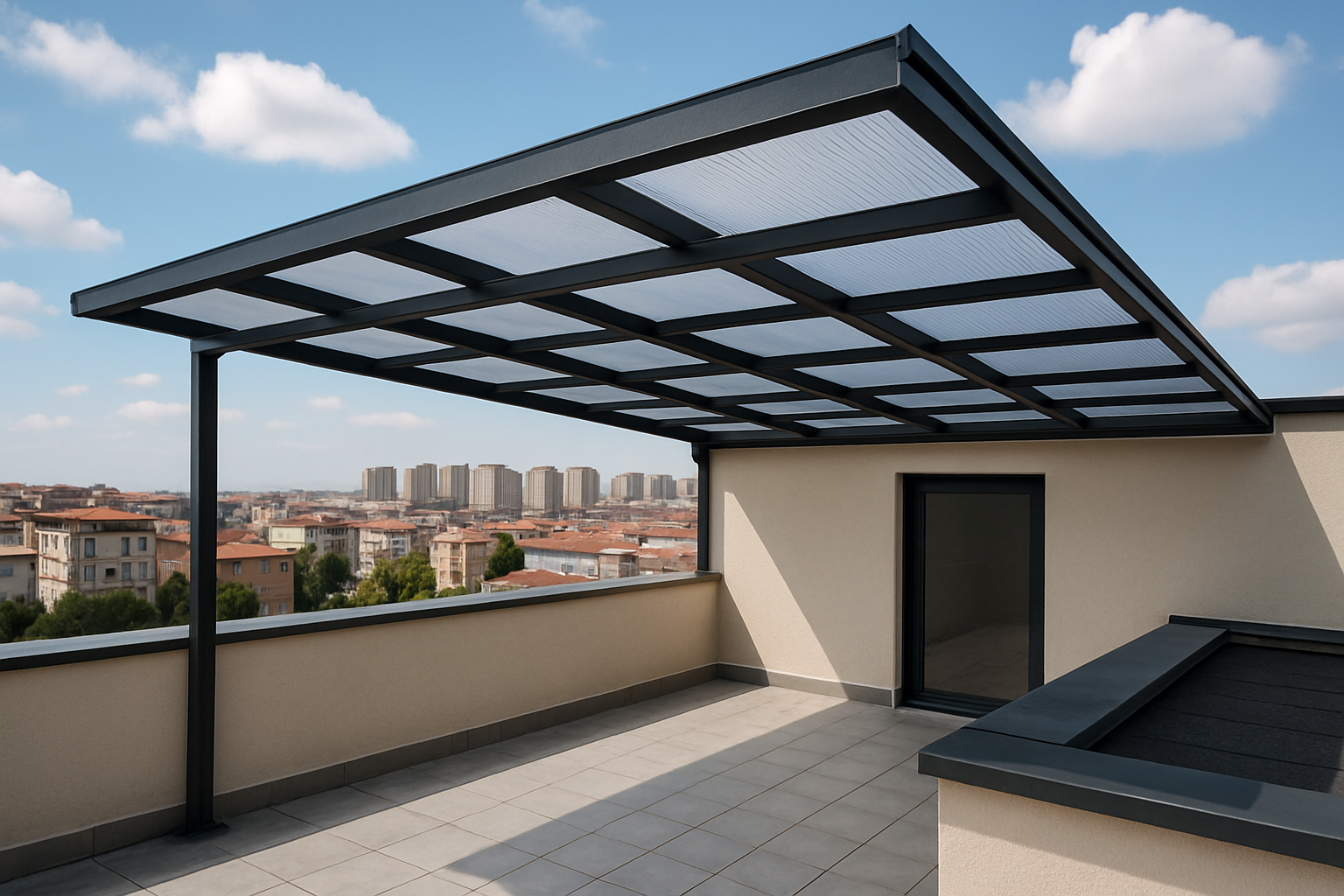 Apartman terası için yağmur ve güneş korumalı, hafif çelik gövdeli polikarbon kaplama sundurma imalatı ve montajı gerçekleştirildi. Taşıyıcı sistem anti-pas boya ile güçlendirildi. Estetik ve modern görünüm sağlandı.